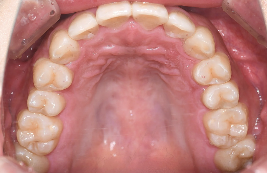 上下ともに狭窄歯列、下顎前歯には叢生(歯のガタつき)、上顎前歯の突出感が認められました。