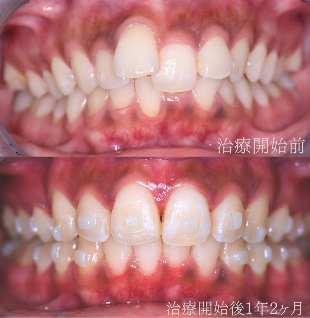 【前歯のがたつき、上顎前突(出っ歯)改善】治療開始後1年2ヶ月の経過写真です。