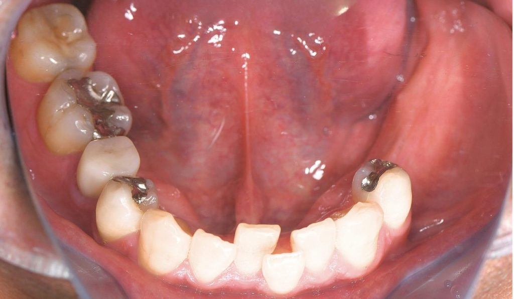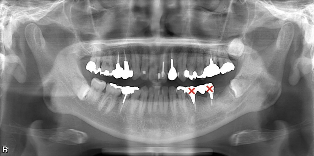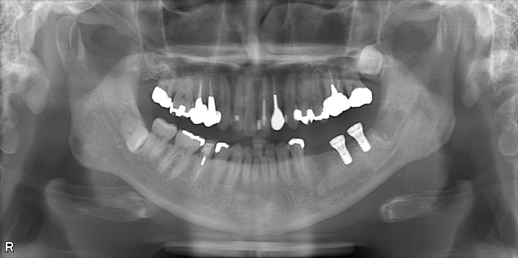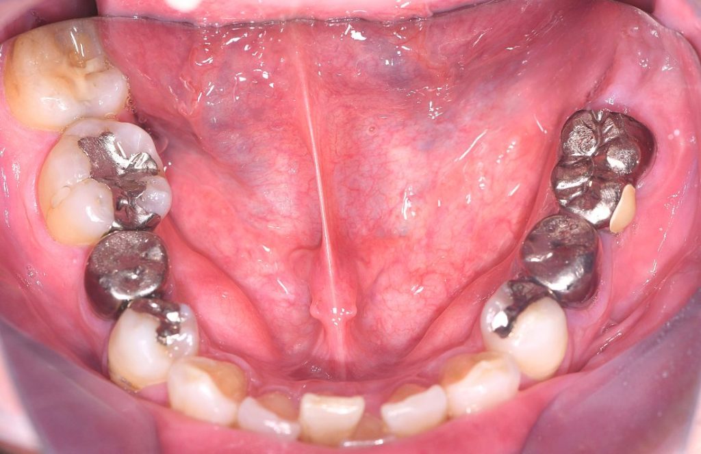 左下7(第二大臼歯)は、歯根破折により数年前に他院で抜歯済み。